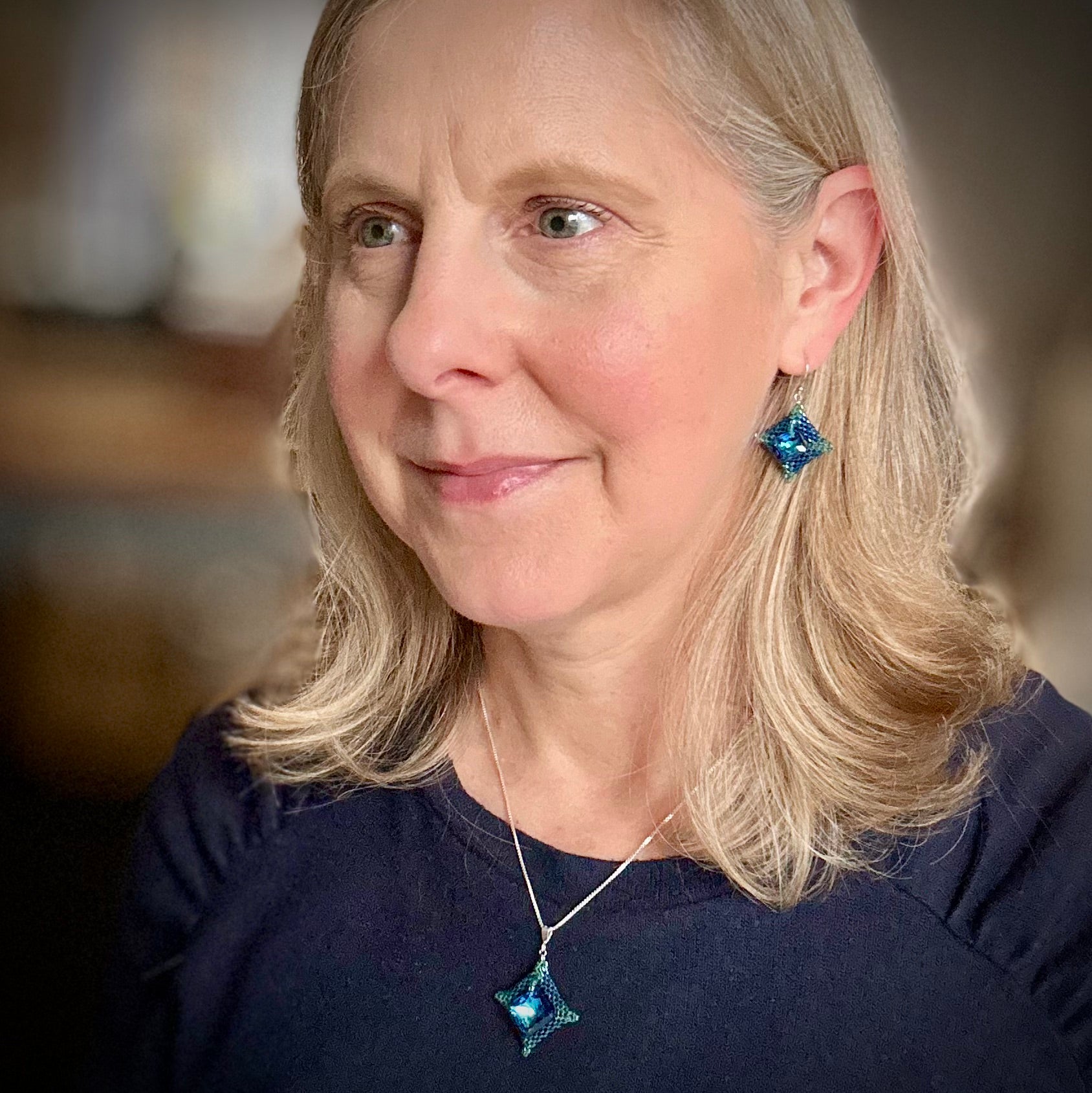 I surrounded the diamond-shaped pendant (slightly larger than the earrings) with blue and green Miyuki delica seed beads and finished it with a sterling silver bail. It dangles from an 18" sterling silver box chain (box chains do not tangle!) Total length 1 1/2."