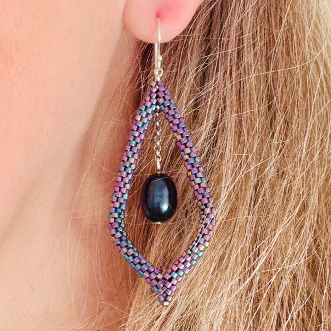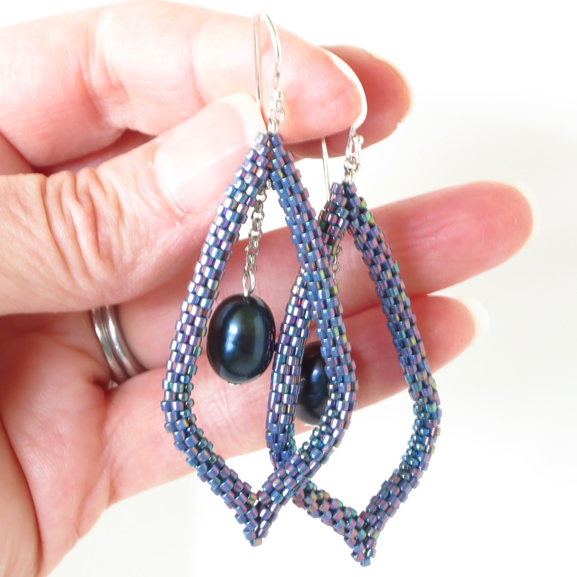 Long and elegant, these pointed teardrop earrings move beautifully when dangling from your lobes. The suspended pearl moves independently from suspended chain links. One of my interests is exploring increases and decreases in peyote stitch, and these took a bit of experimentation to come together.