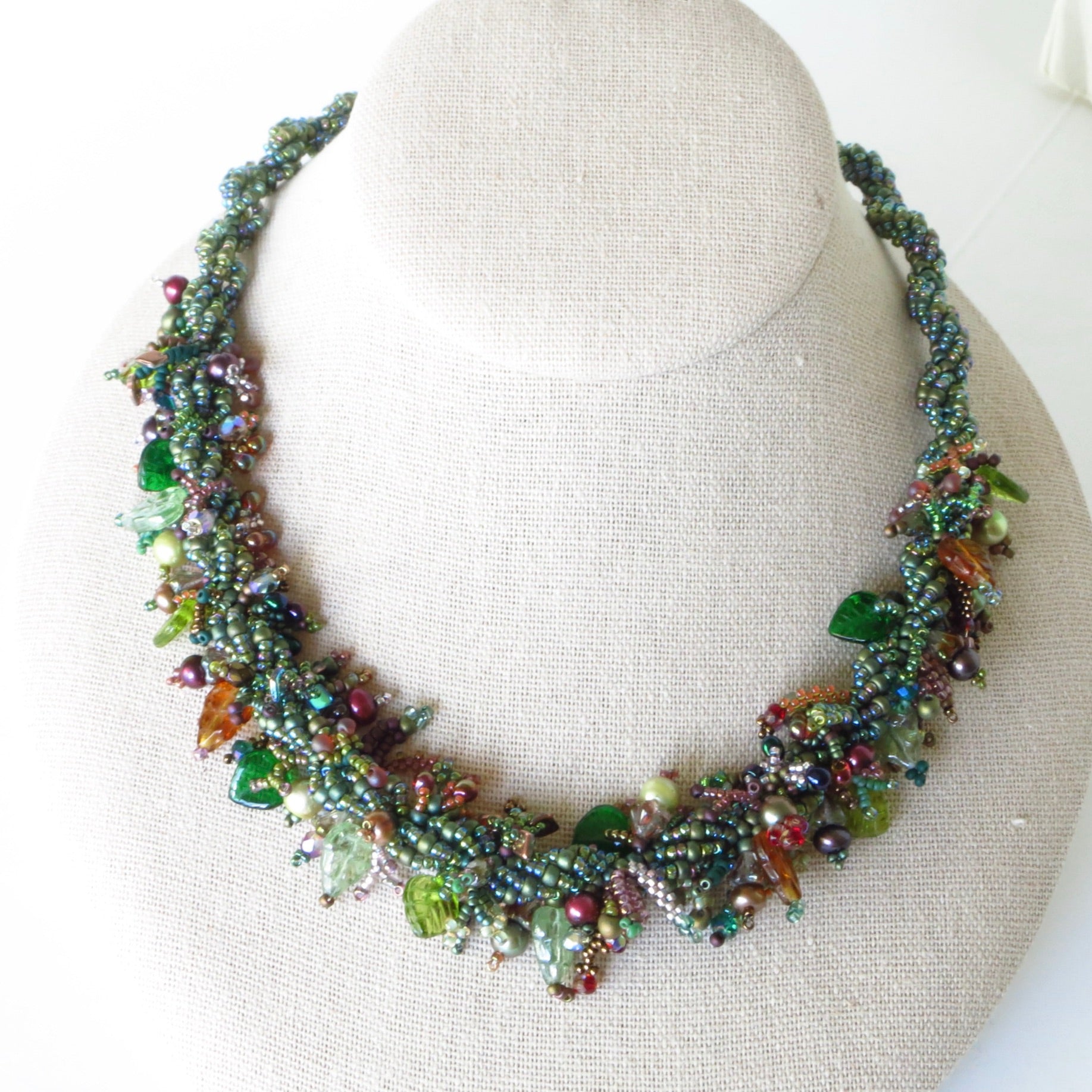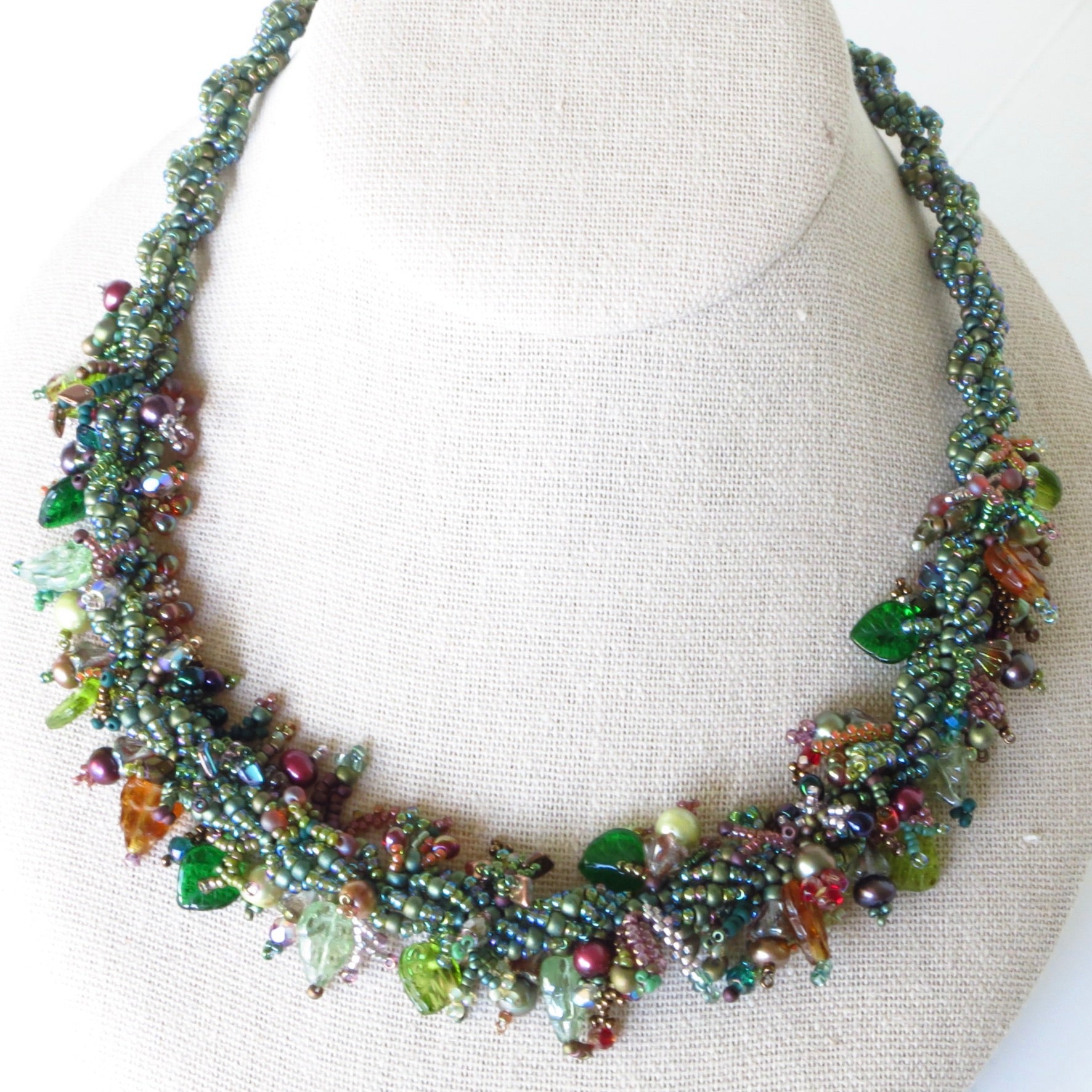 Indulge your love for the ocean with my Mermaid Jewelry Collection. I had a great time creating this variation on my mermaid necklaces. I started with a spiral rope in iridescent greens, then embellished the central selection with a variety of seed beads, natural pearls and glass beads. The effect is rich and whimsical! I added a mother of pearl toggle clasp--finished length is just under 19." So fun!