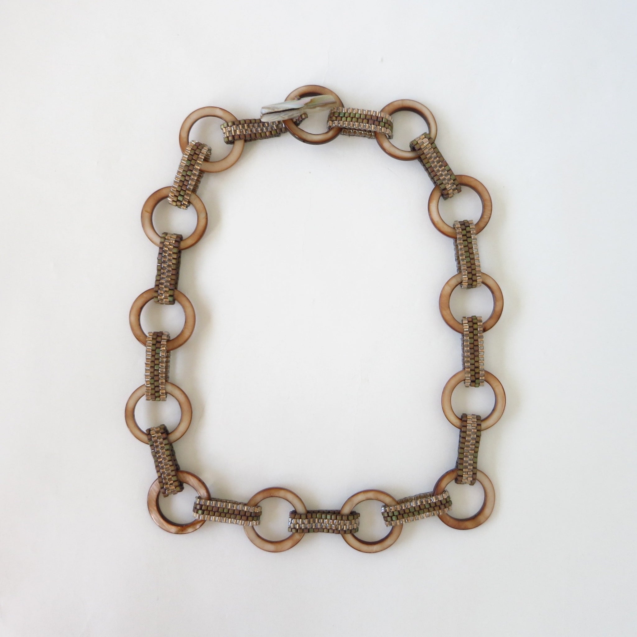 These mother of pearl donut links are just gorgeous to work with. They are 1" round, and I created supple connectors using small square beads, and the necklace feels nice against the skin. The links will turn when worn for a lovely effect. For smaller necks, the toggle can go into any link. Approx. 20" in length with a mother of pearl clasp.