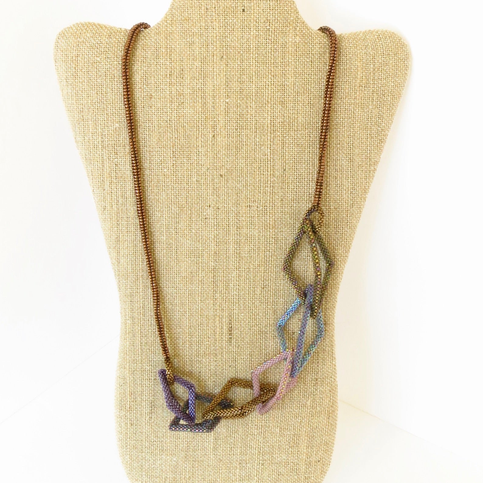This experimental necklace began when I started making these open geometric shapes last year.  I wanted to see what they would look like when linked together to hang asymmetrically.  I finished it with a copper seed bead rope and beaded toggle clasp.An original one-of-a-kind piece--for sure to be a conversation starter!