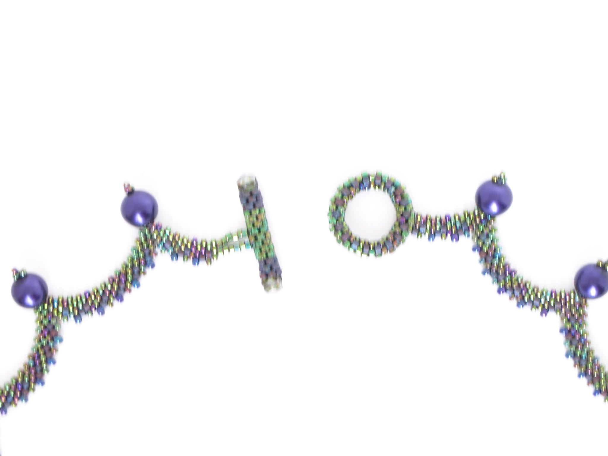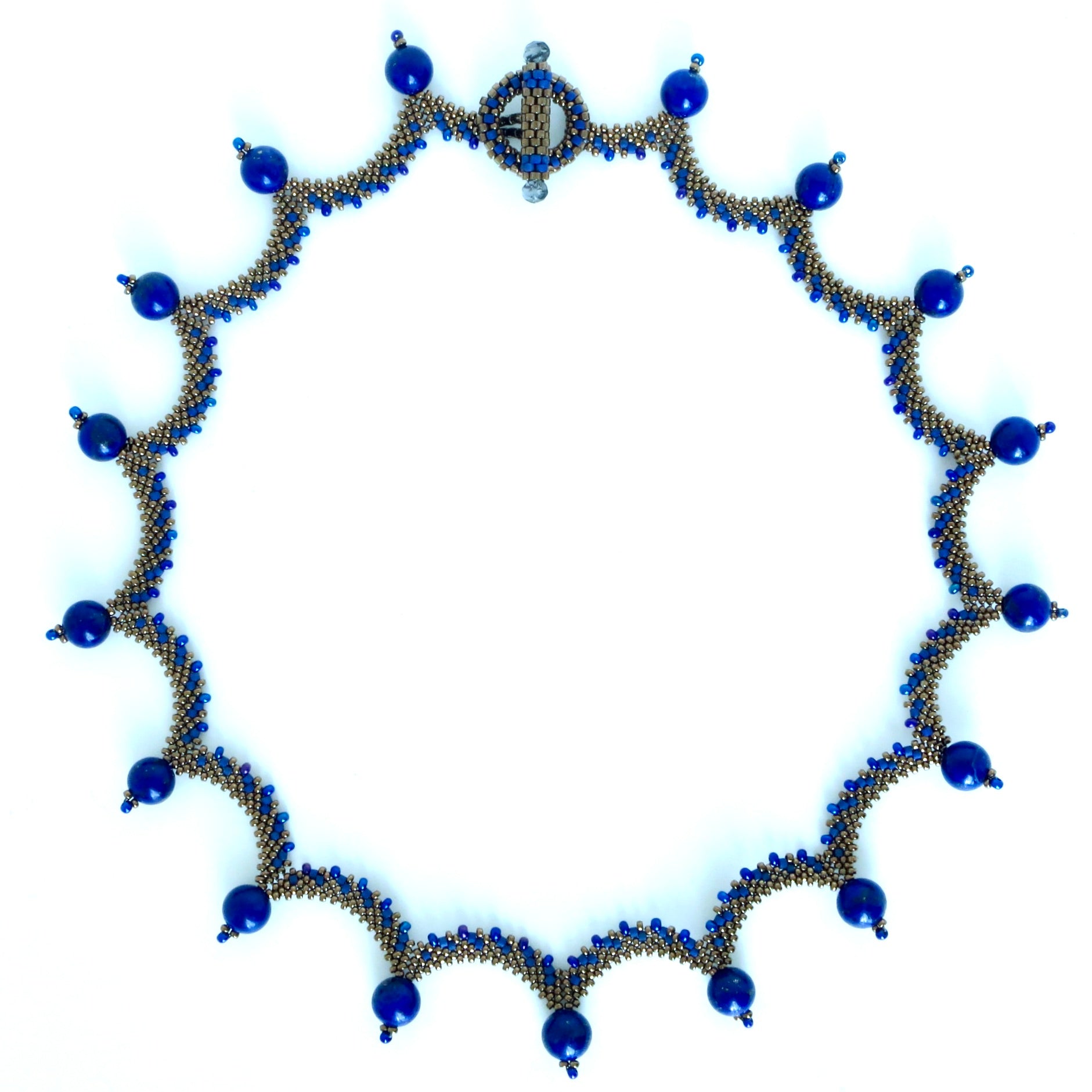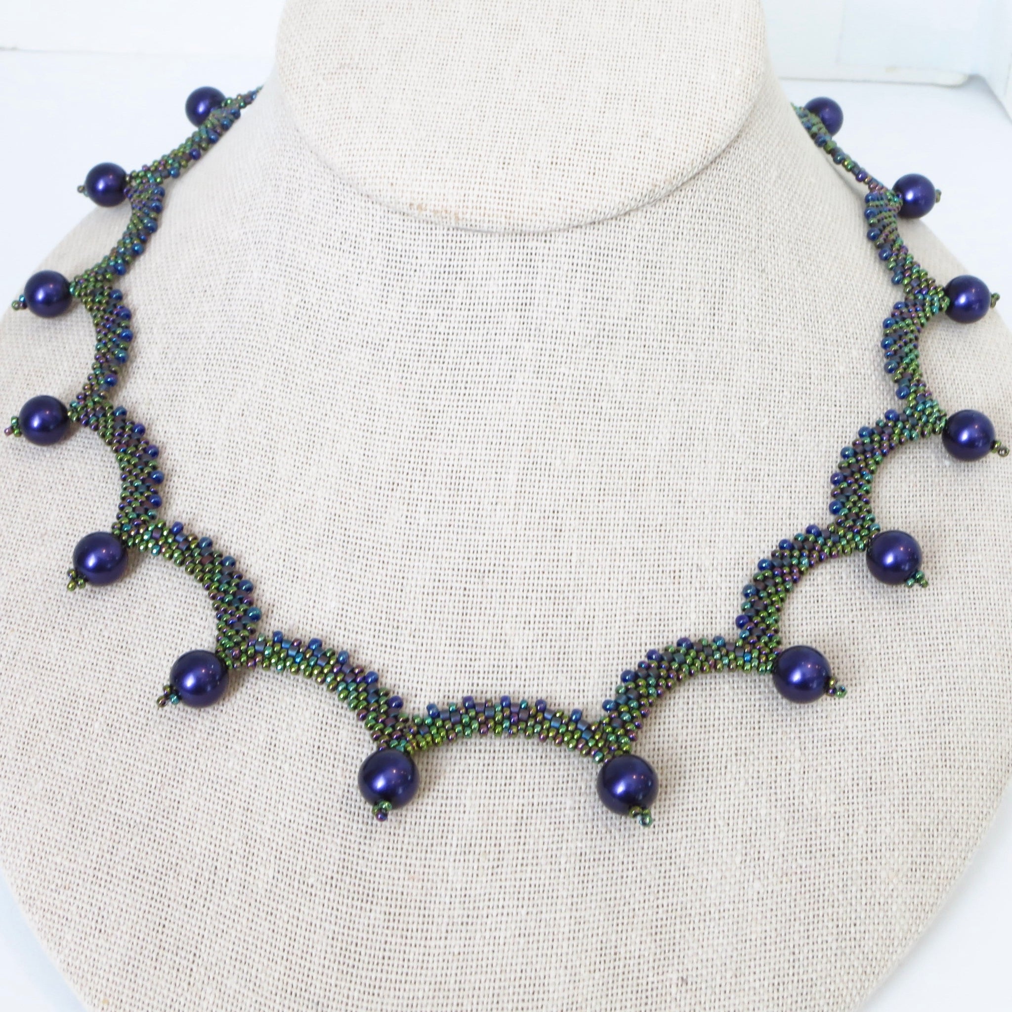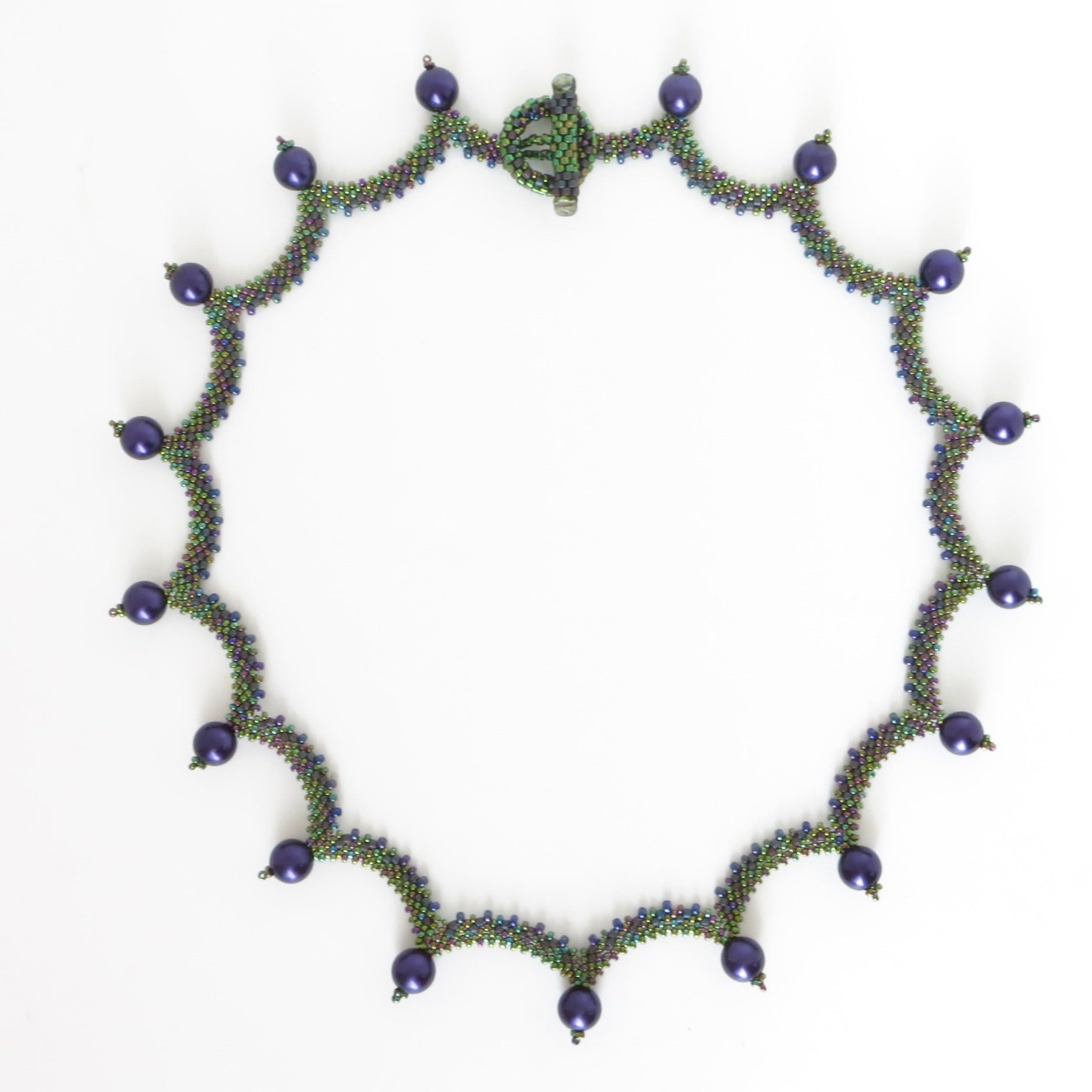 My vision for this necklace was delicate, lacy drops of color reminiscent of dewy leaves. It took me a few tries to get the stitching right, with the multiple increases and decreases, but what a pleasing effect! I used seed and cylinder beads in various sizes, and finished with high-quality purple glass pearls. I made another option with lapis lazuli beads as well. To finish I created a beaded toggle for a clasp. Approx. 18" in length.